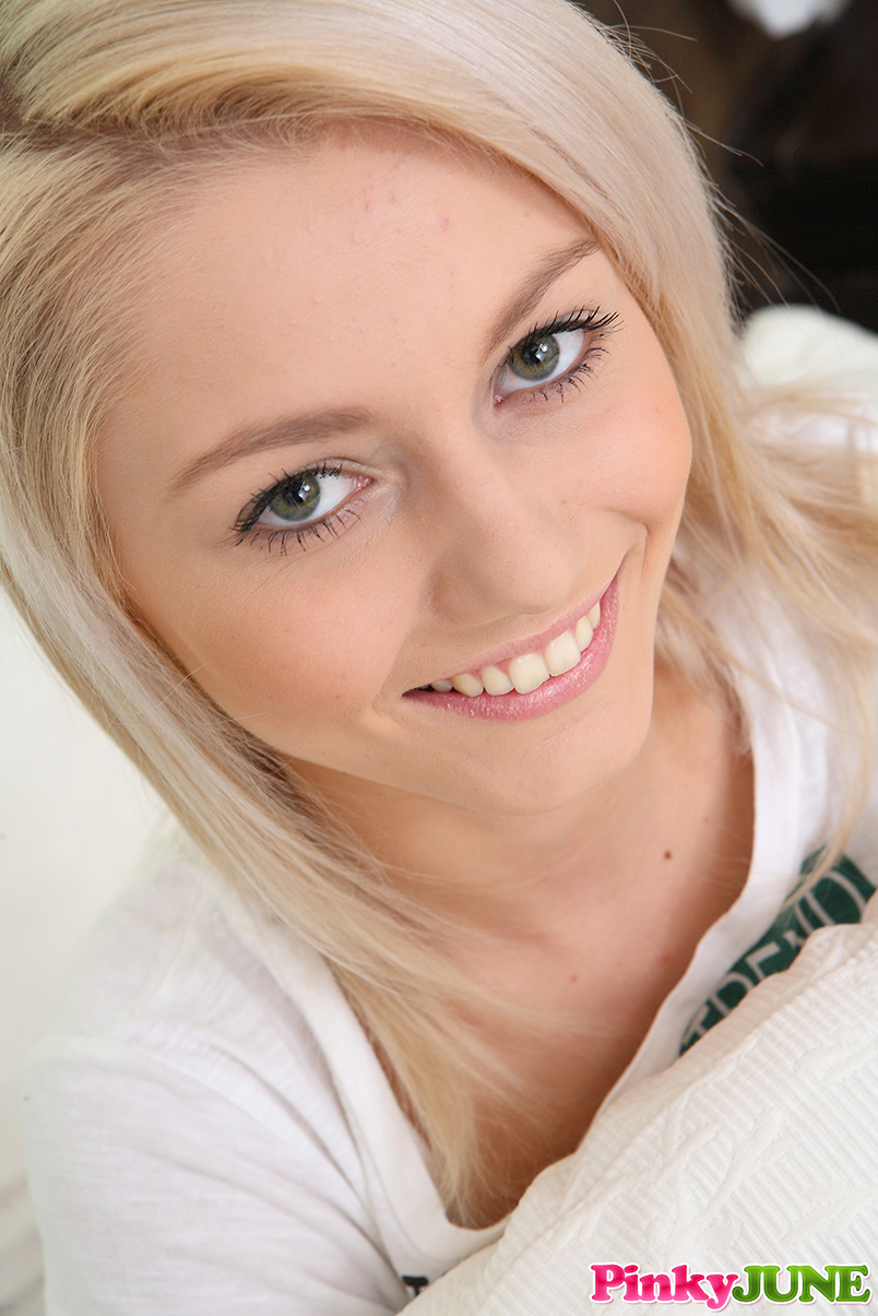 Blue-eyed blonde Pinky June rides a dildo pillow