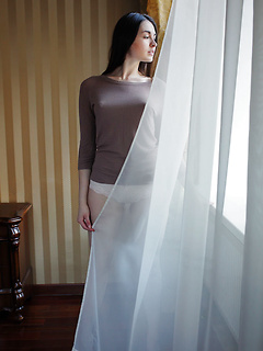 Cute brunette girl Kara from Russia, she shows her sexy young body - bald pussy and small tits in Room To Move