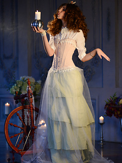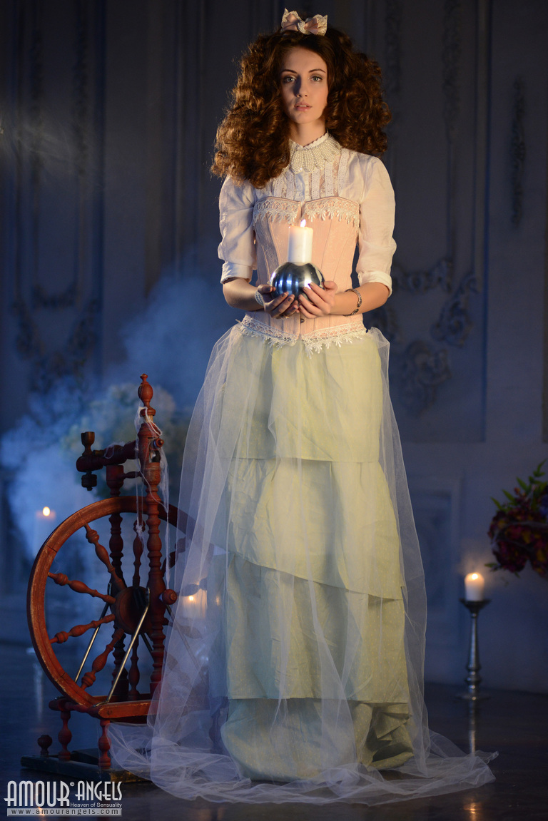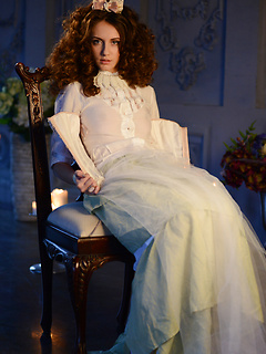 Leggy teen model Lucy G peels off white lingerie and stockings for nude poses