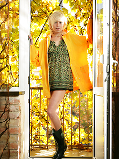 Petite blonde babe Kerstin Dorsia showing her sexy long legs outdoors