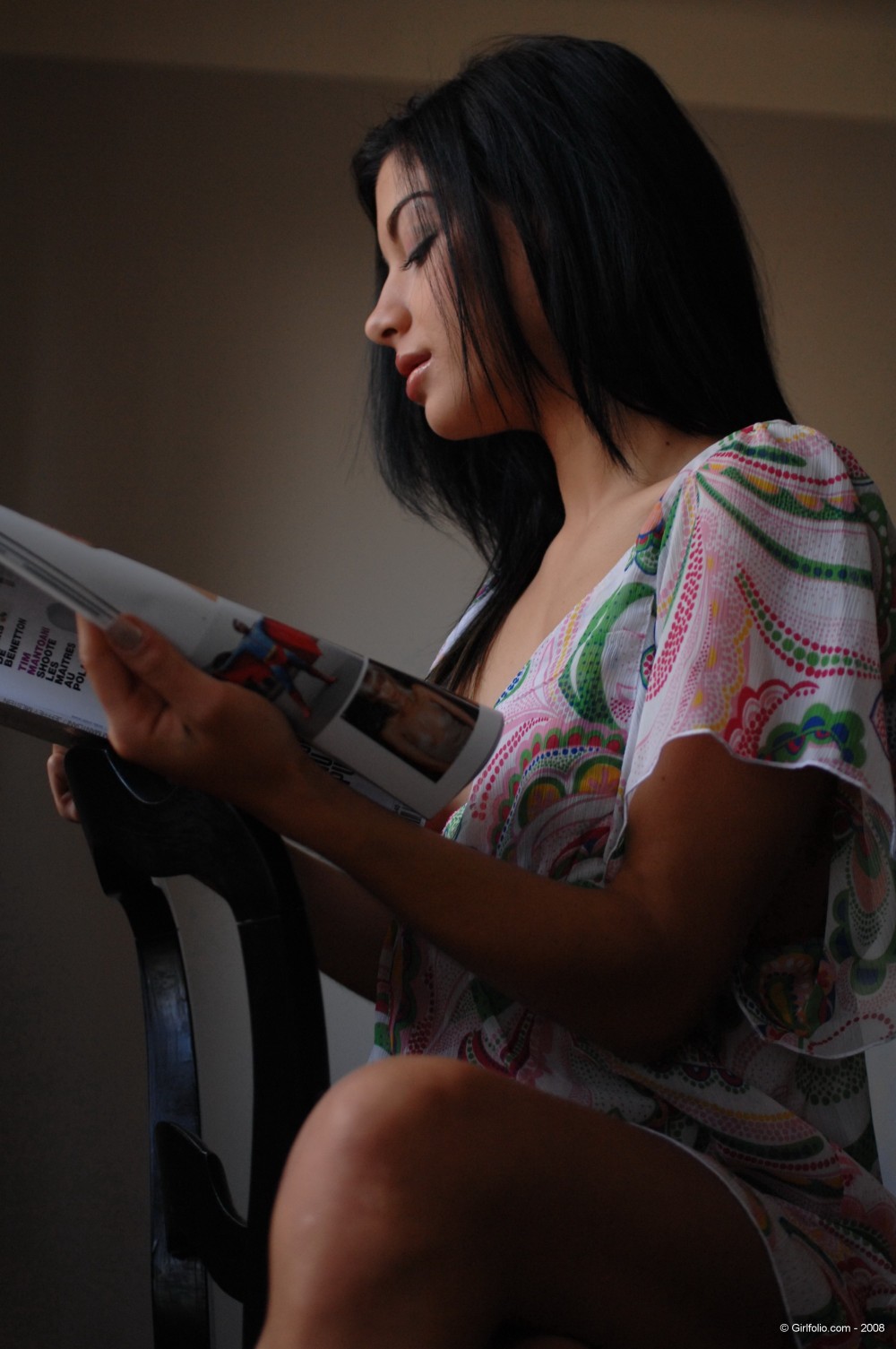 Nerdy teen Callie Klien unveils her small breasts and shaved vagina on a chair