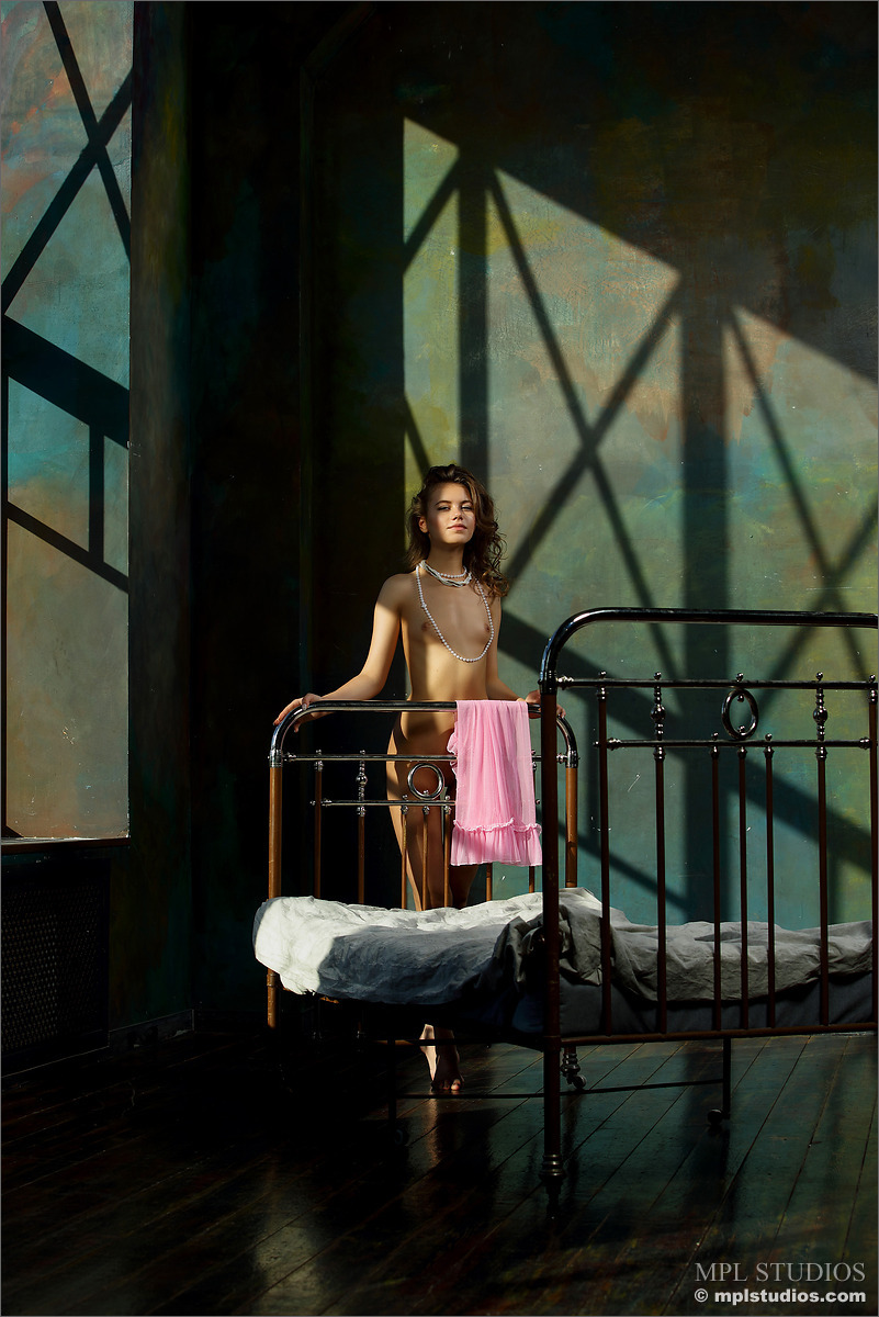 Cute brunette girl Kara from Russia, she shows her sexy young body - bald pussy and small tits in Room To Move