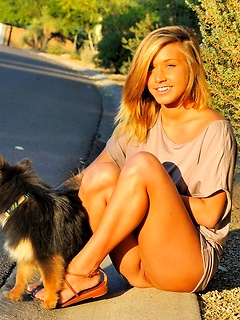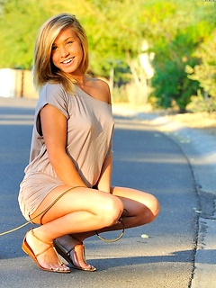 Petite blonde Devine One Brittany-Lynn flashes her perky tits and tight pussy outdoors at the track