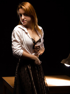 Nerdy teen Callie Klien unveils her small breasts and shaved vagina on a chair