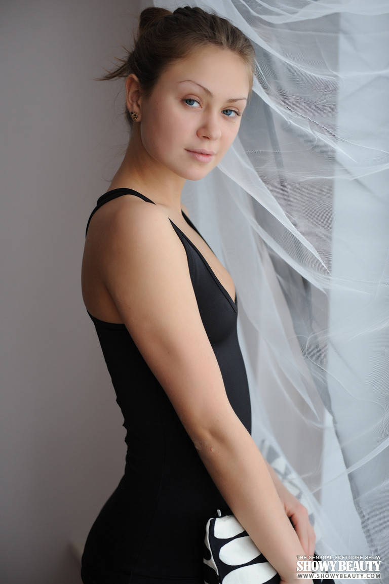 Leggy teen model Lucy G peels off white lingerie and stockings for nude poses
