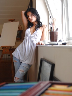 Cute brunette girl Kara from Russia, she shows her sexy young body - bald pussy and small tits in Room To Move