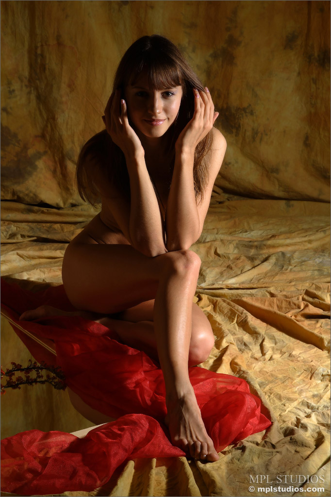 Cute brunette girl Kara from Russia, she shows her sexy young body - bald pussy and small tits in Room To Move