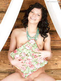 Cute brunette girl Kara from Russia, she shows her sexy young body - bald pussy and small tits in Room To Move