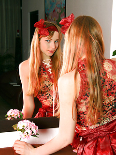 Lovely teenie strips off her hot red lingerie staying totally naked and flashing her pussy